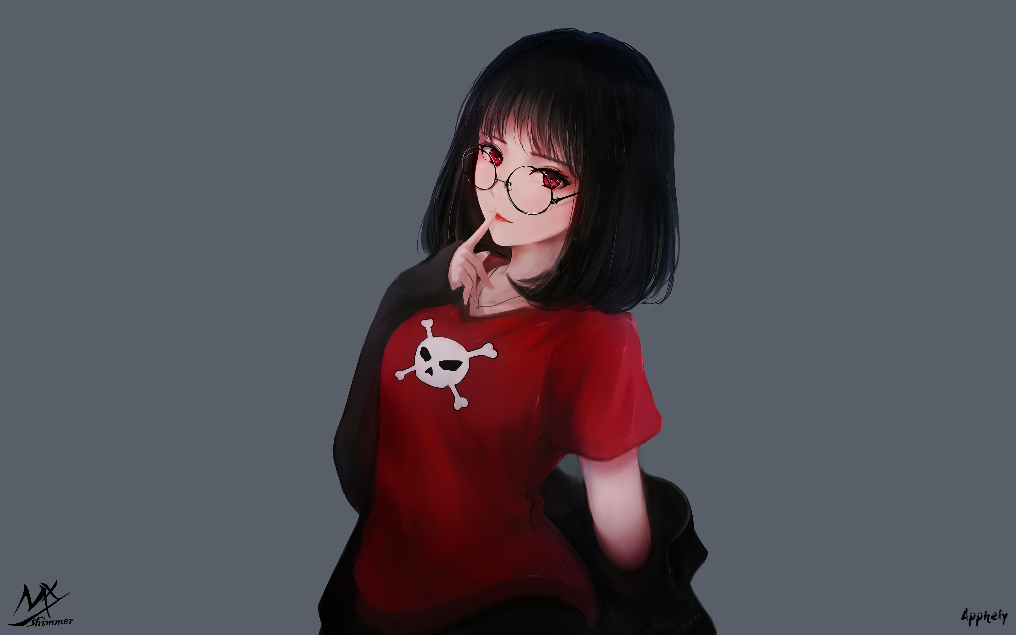 - Home > Aesthetic Wallpaper >Free download Glitter Red Eyes Anime Girl Glasses Thinking Skeleton Skeleton Shirt 4K Wallpaper