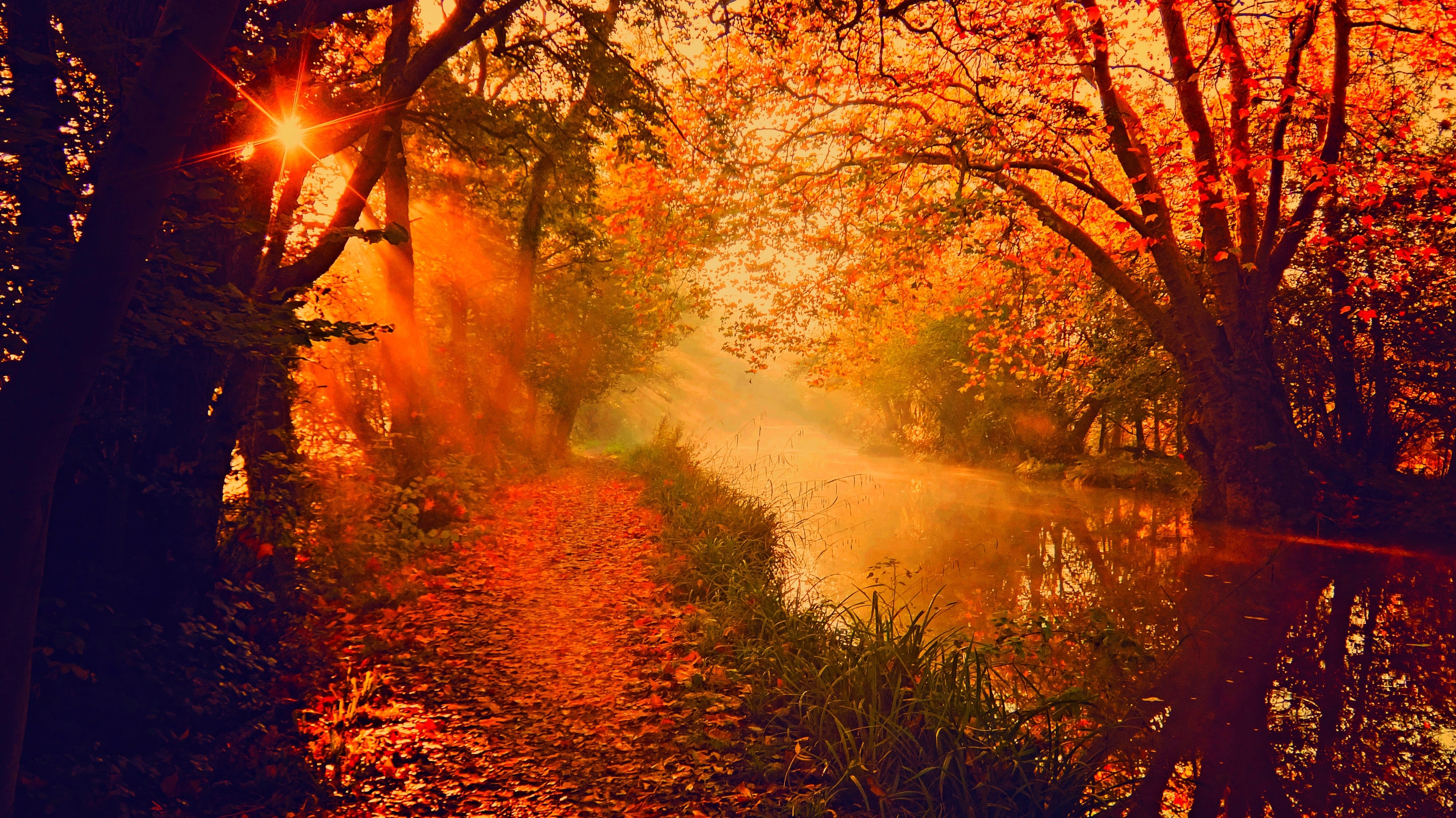 Free download Trees River Sunlight Autumn Nature Sunlight Fallen Leaves Computer Wallpaper 4K Wallpaper...