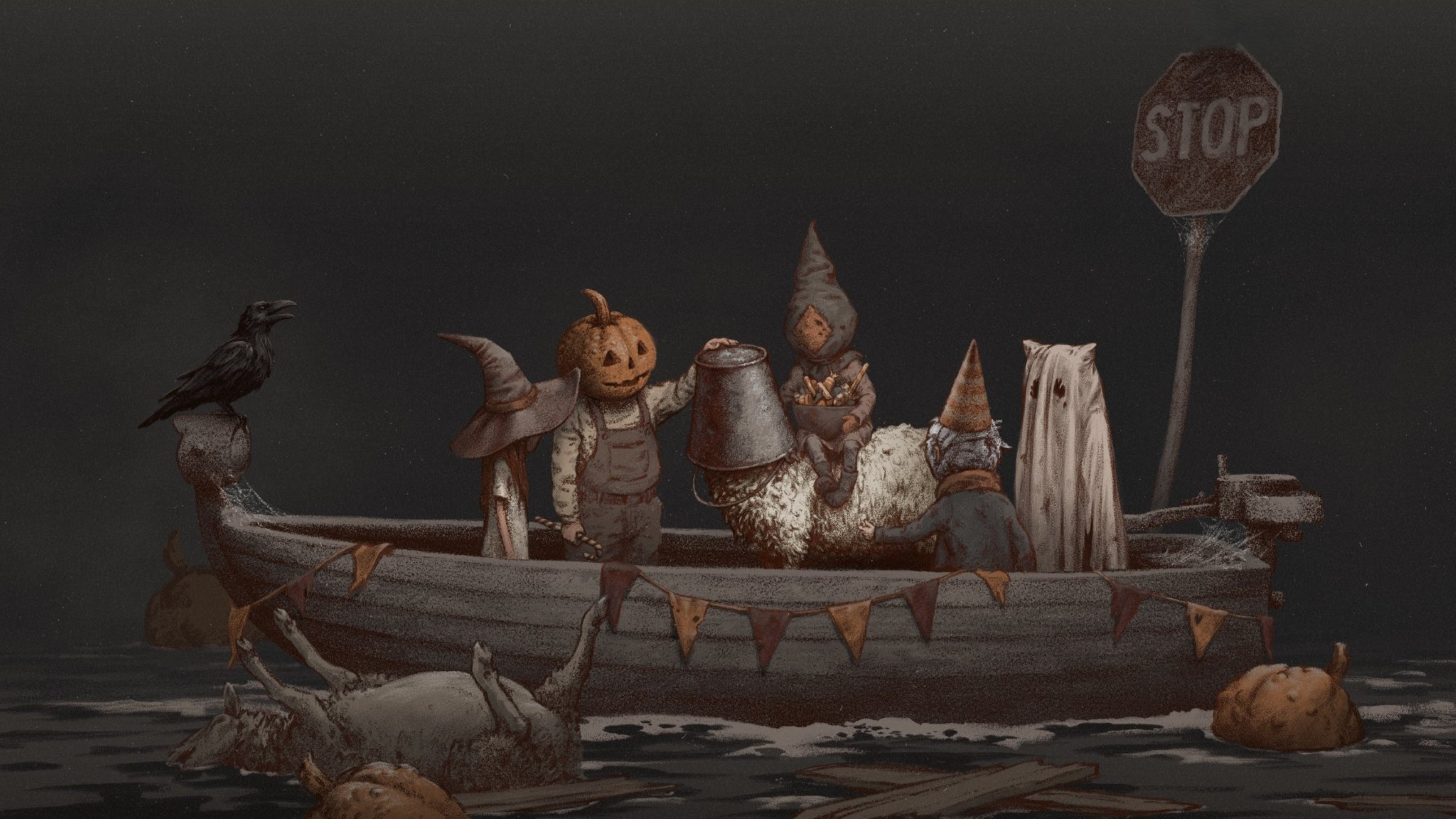 - Home > Anime Wallpaper >Free download Zoo Halloween Boat Crow Pumpkin Sheep Witch Hat Simple Background Water 4K Wallpaper