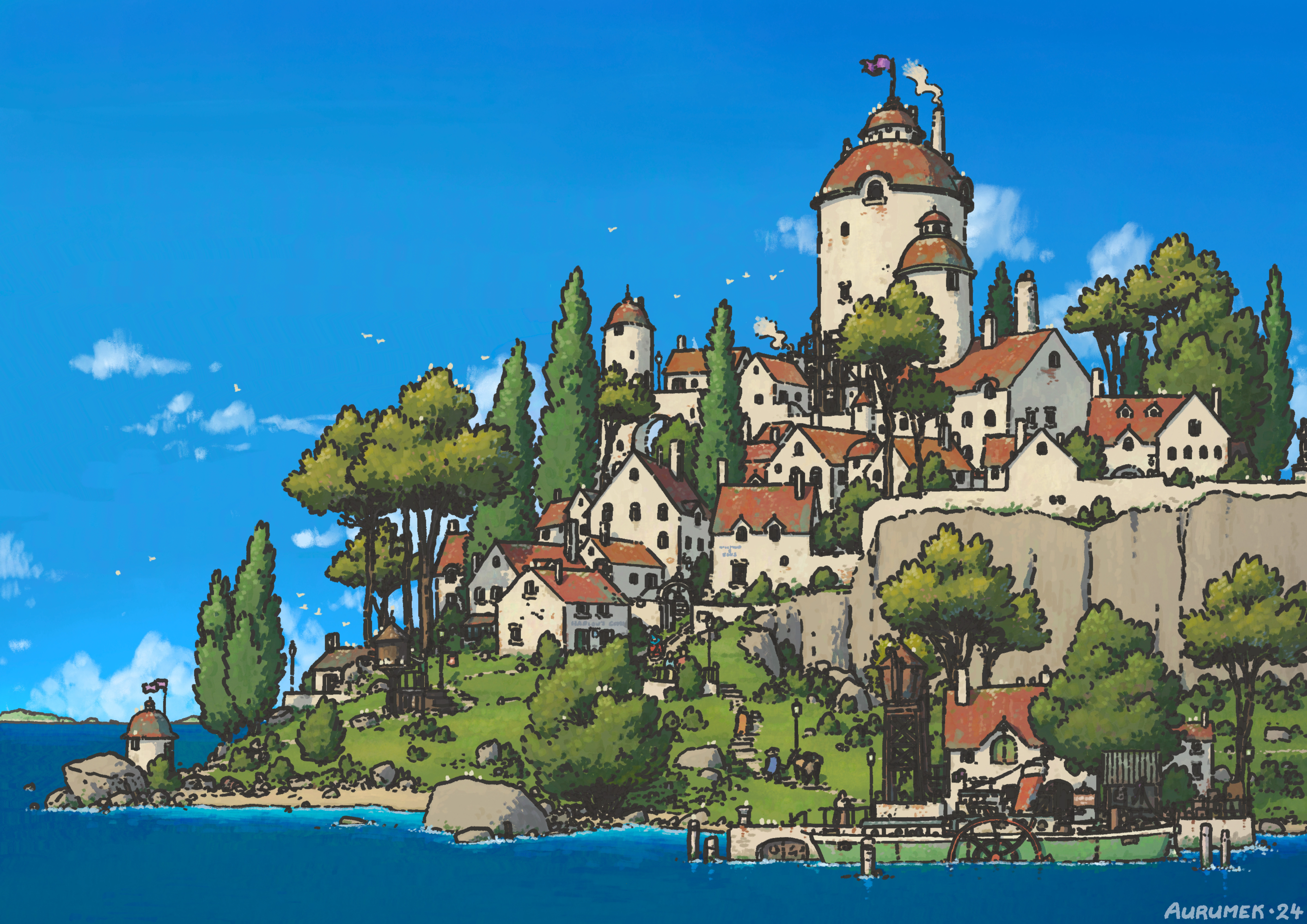 - Home > Gaming Wallpaper >Free download Artwork Digital Art Digital Painting Landscape Nature Town Ocean Water Trees 4K Wallpaper