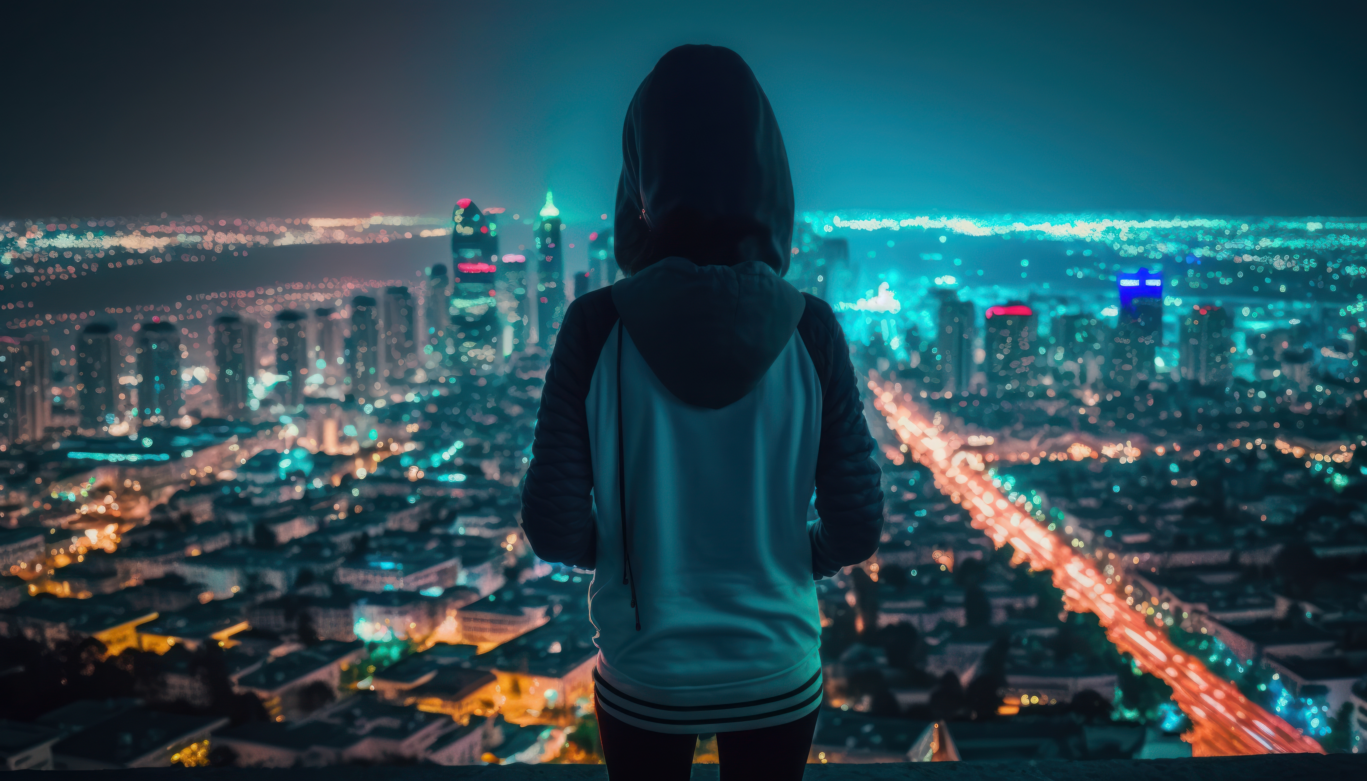 - Home > Landscape Wallpaper >Free download Female Art City Skyline Night City Lights Cyan Cityscape Hood 4K Wallpaper