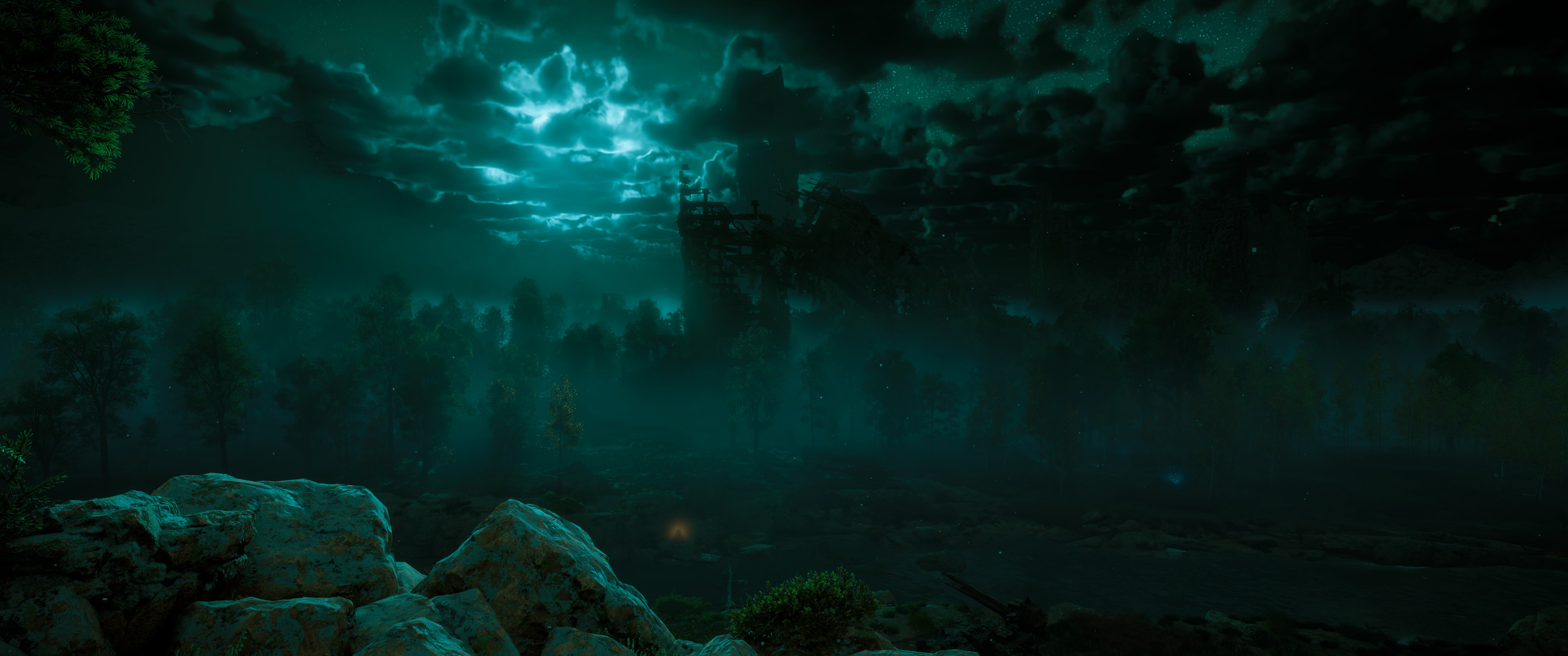 Horizon Zero Dawn Night Moonlight Mist Ruins Doomsday Video Games Digital Art Ultra-Wide Forest Clouds Trees Sky CGI 4K Wallpaper