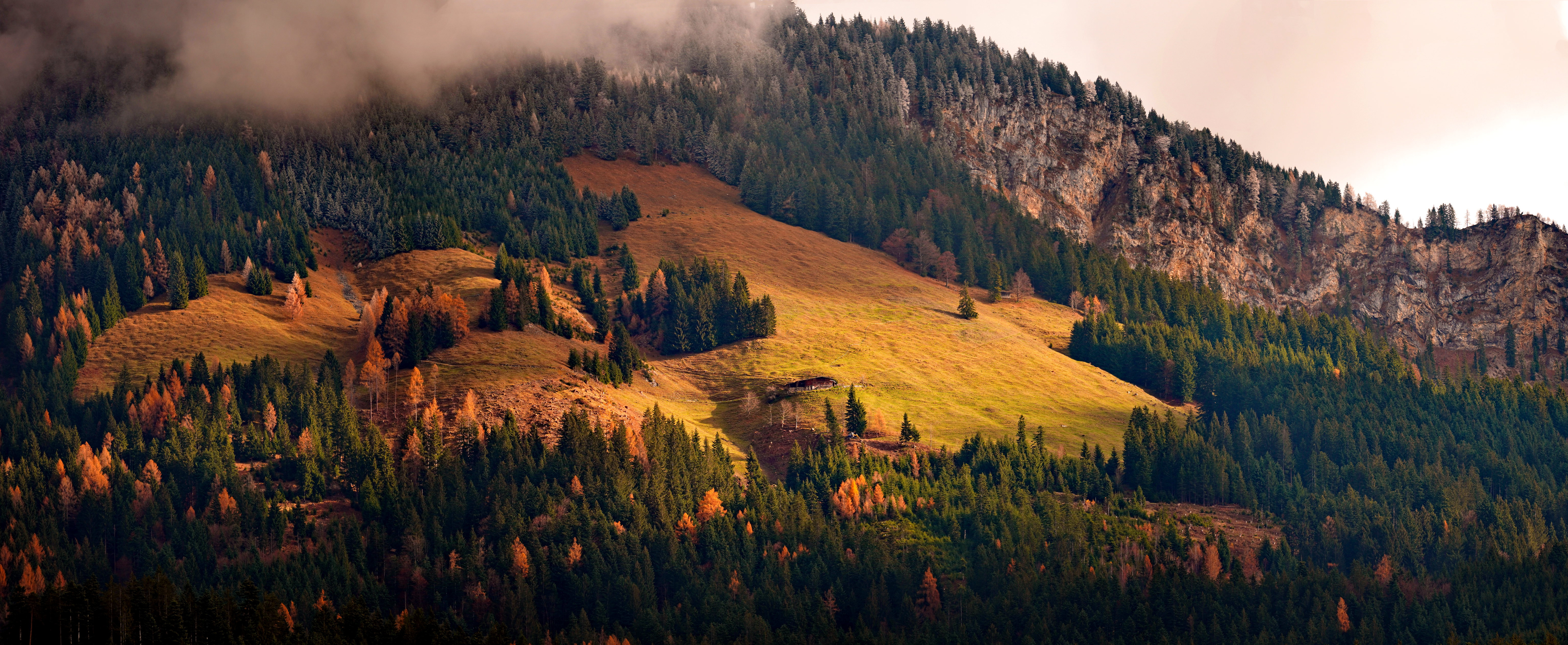 Landscape Mountains Trees Clouds Autumn Pines Ultra-wide Nature 4K Wallpaper