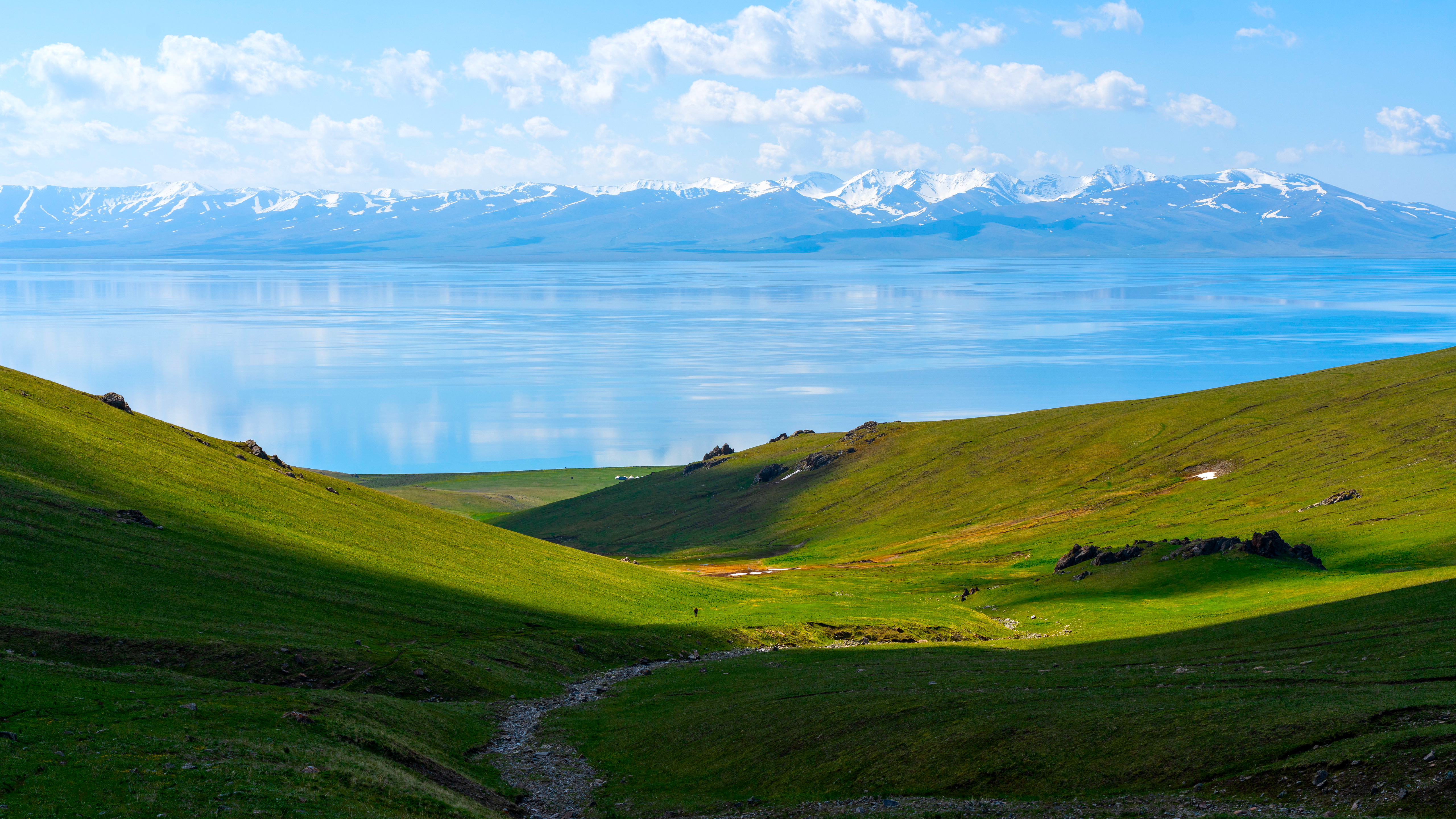 Nature Landscape Hills Meadow Fields Mountains Water Clouds Sky Rocks Vista Sunshine 4K Wallpaper