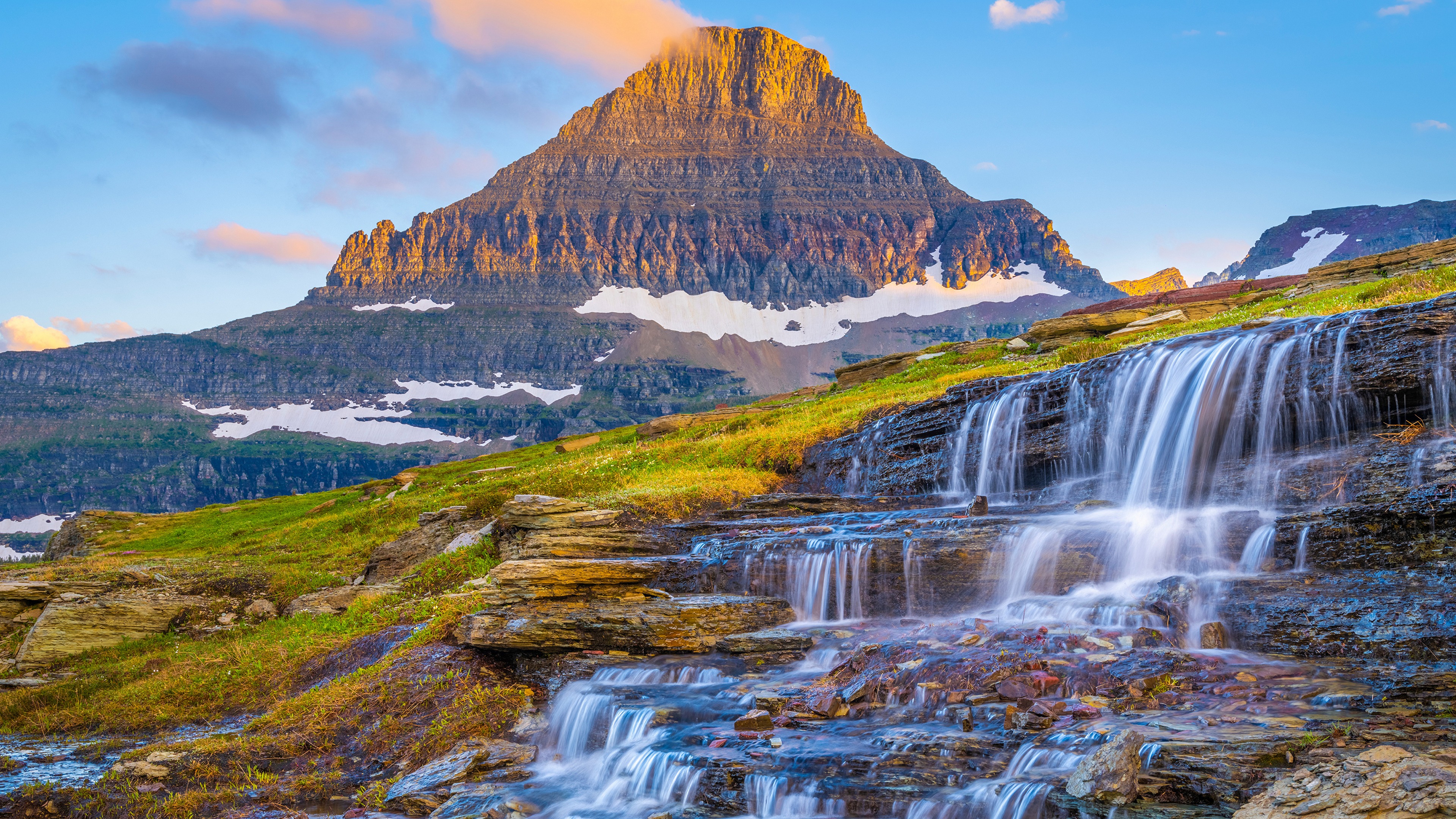 - Home > Landscape Wallpaper >Free download Nature Landscape Mountains Sky Waterfall Rocks Snow Sunset Glow Water Cloud Computer Wallpaper 4K Wallpaper