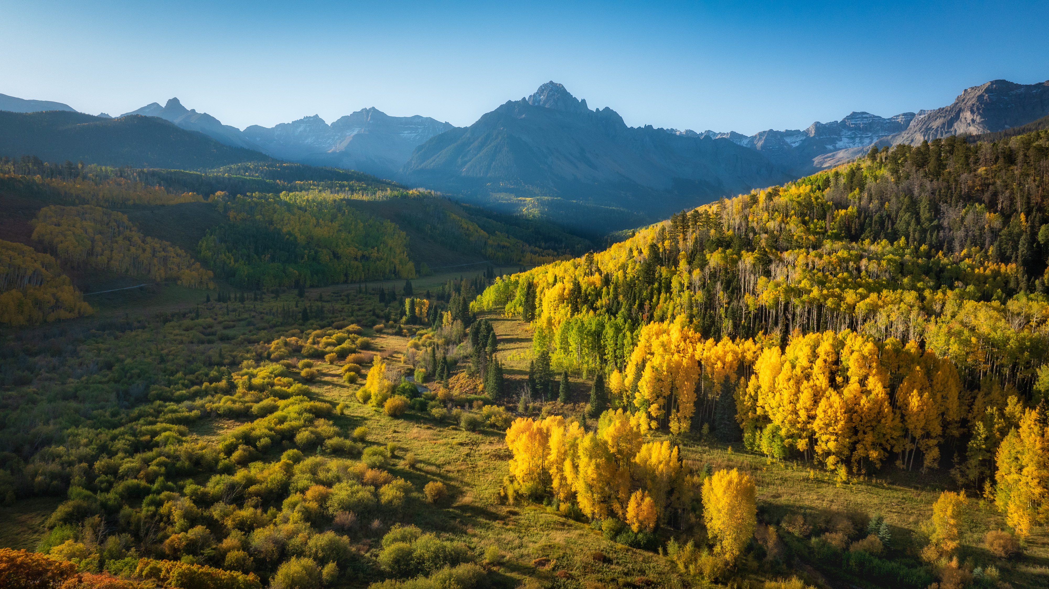 Nature Landscape Trees Forest Grass Mountains Sky Sunshine Autumn 4K Wallpaper