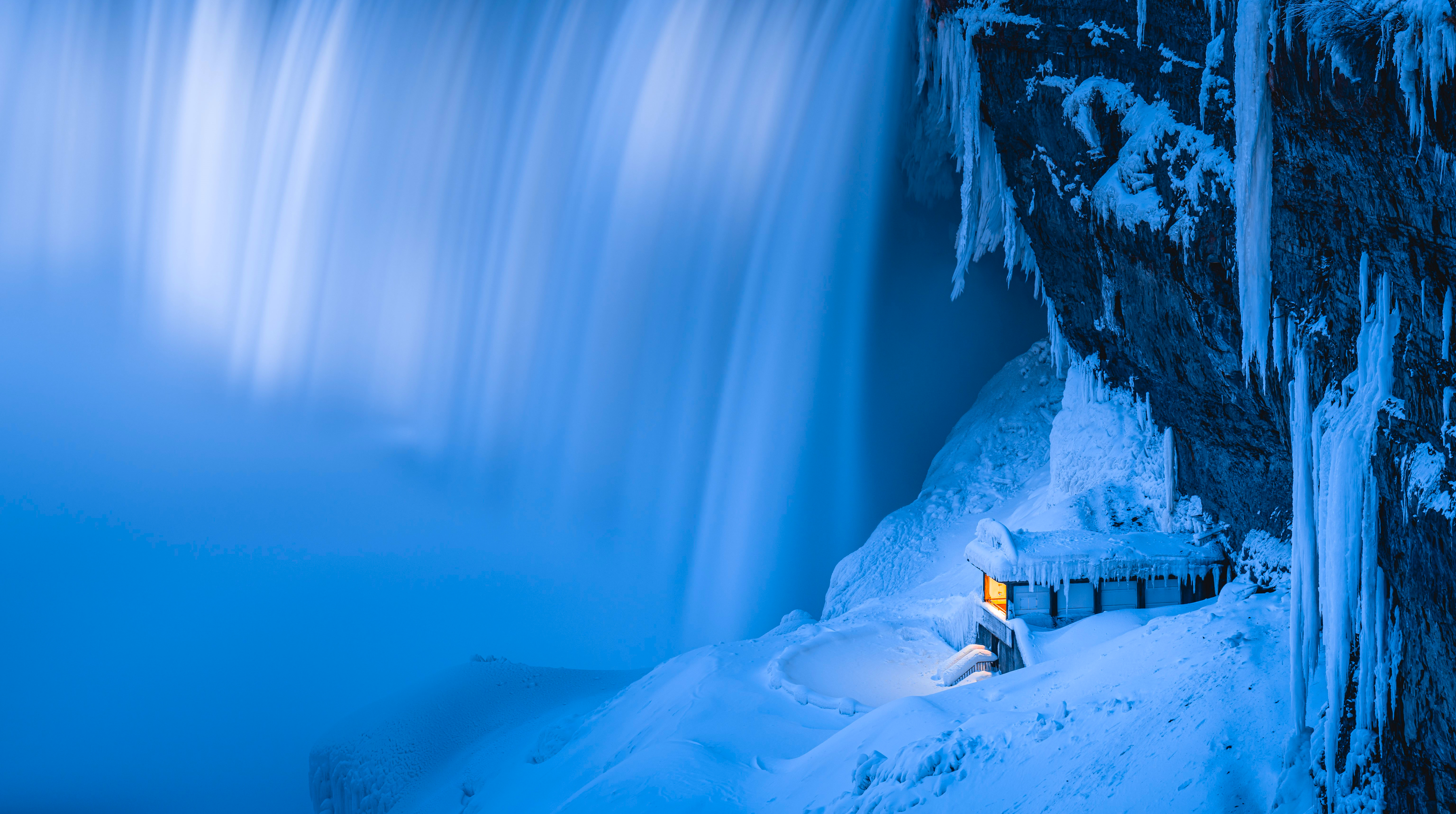 Nature Landscape Water Snow Hut Rock Waterfall Lights Winter Waterfall 4K Wallpaper