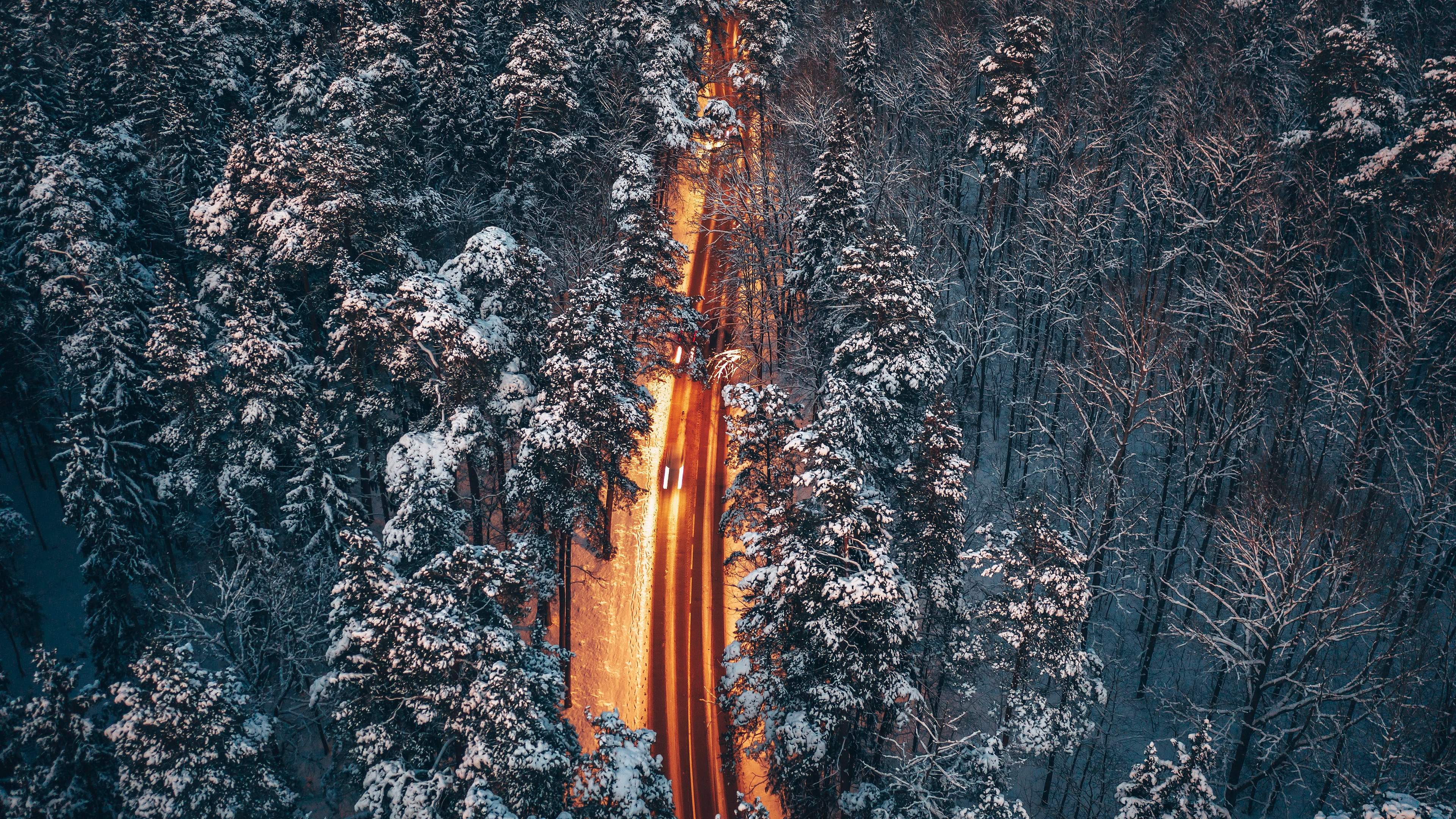 Road Trees Snow Outdoor Forest Winter 4K Wallpaper