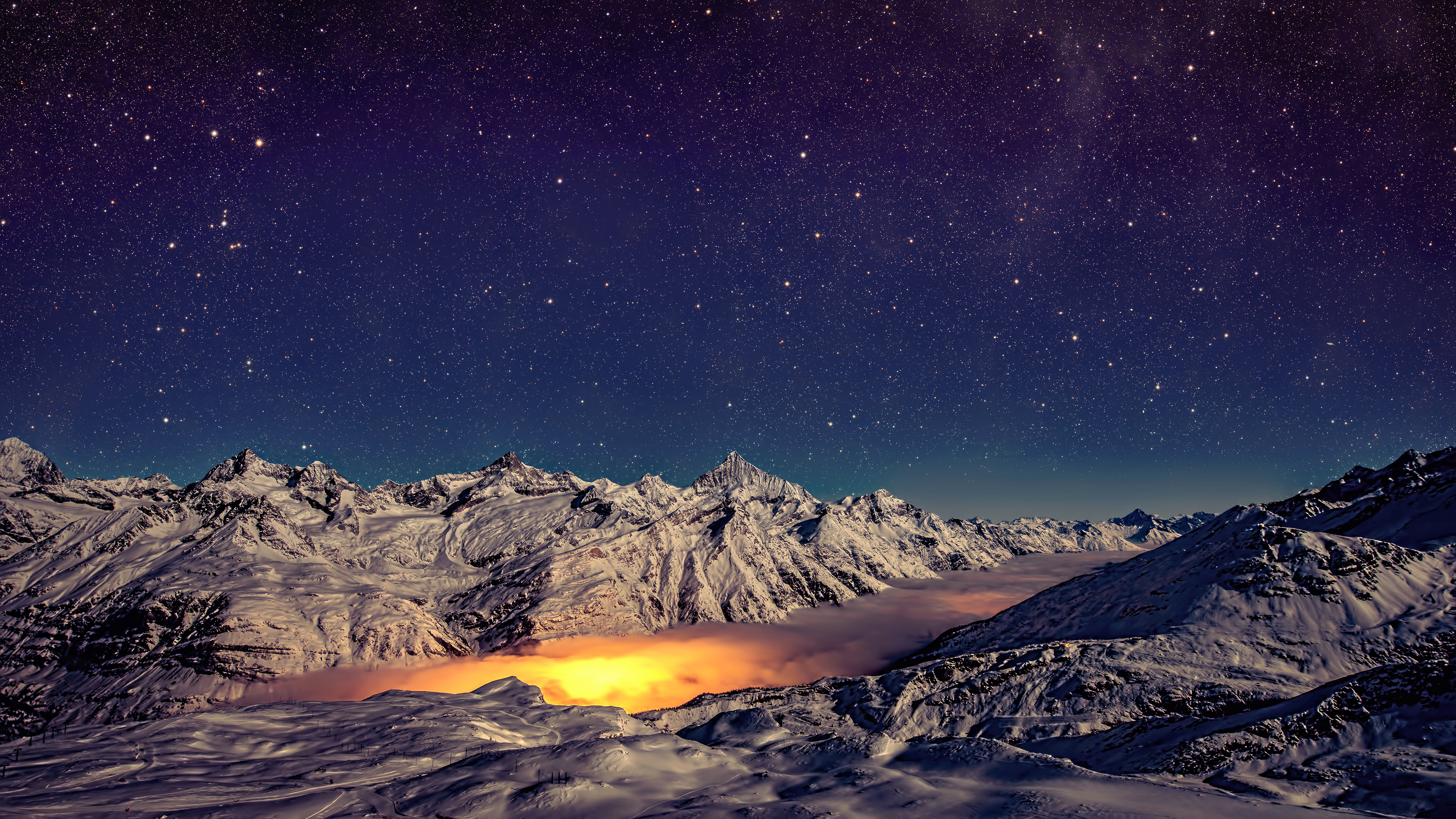Scenery Nature Mountains Panorama Night Stars Snow Look Misty 4K Wallpaper