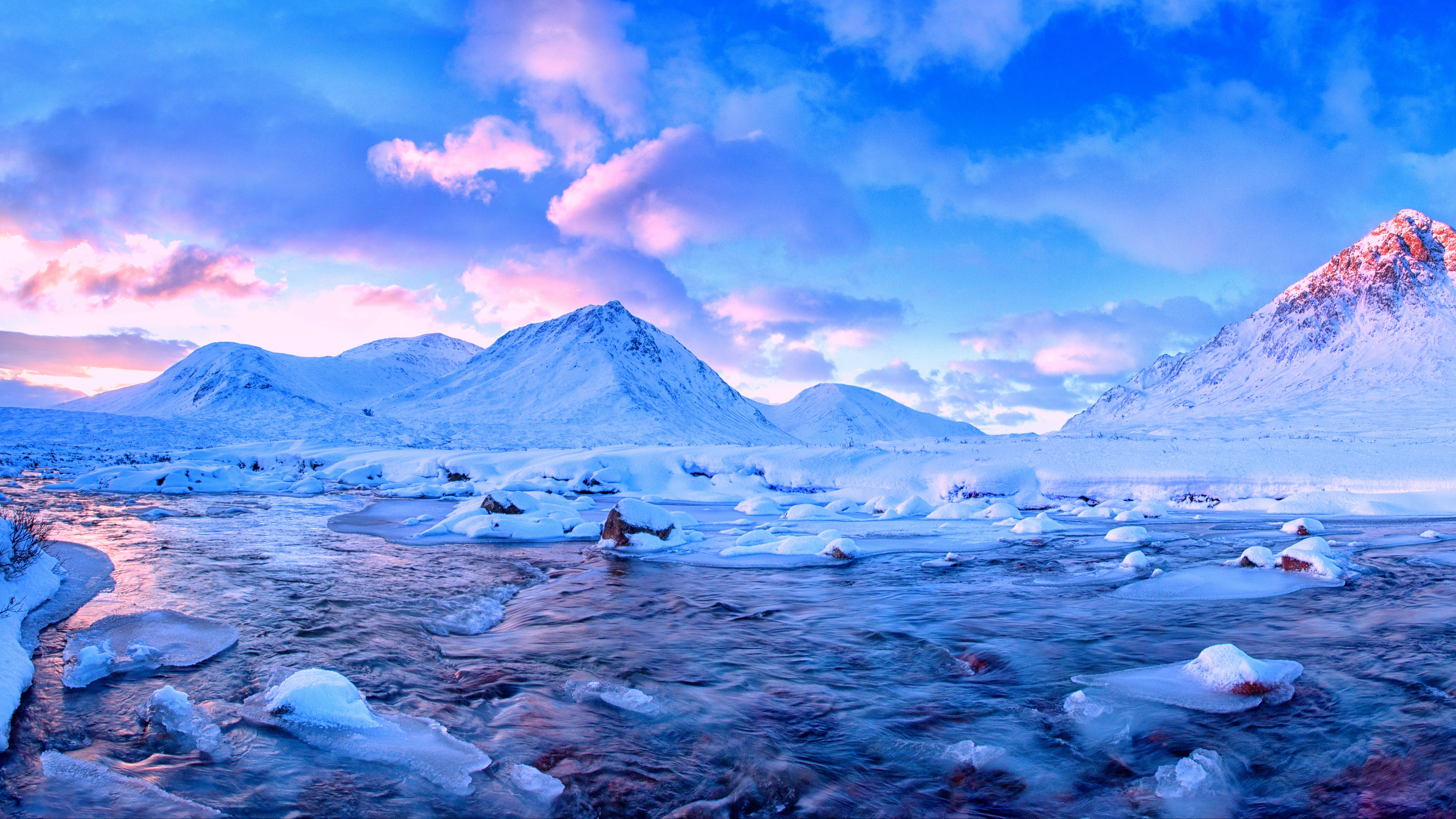 Snow Mountain Clouds Ice River Water Sunshine Sunset Computer Wallpaper 4K Wallpaper