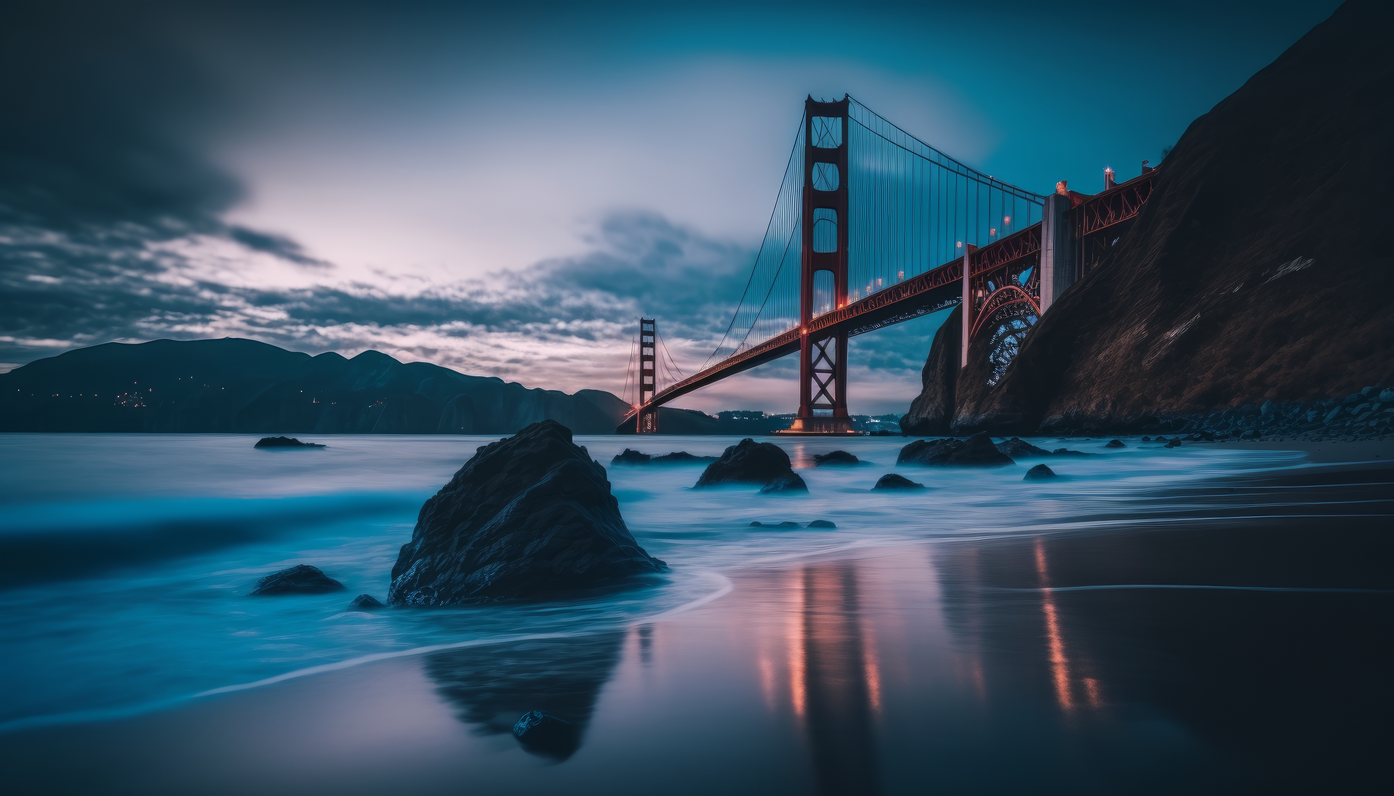 blue bridge water rocks reflection sky clouds waves computer wallpaper 4K wallpaper