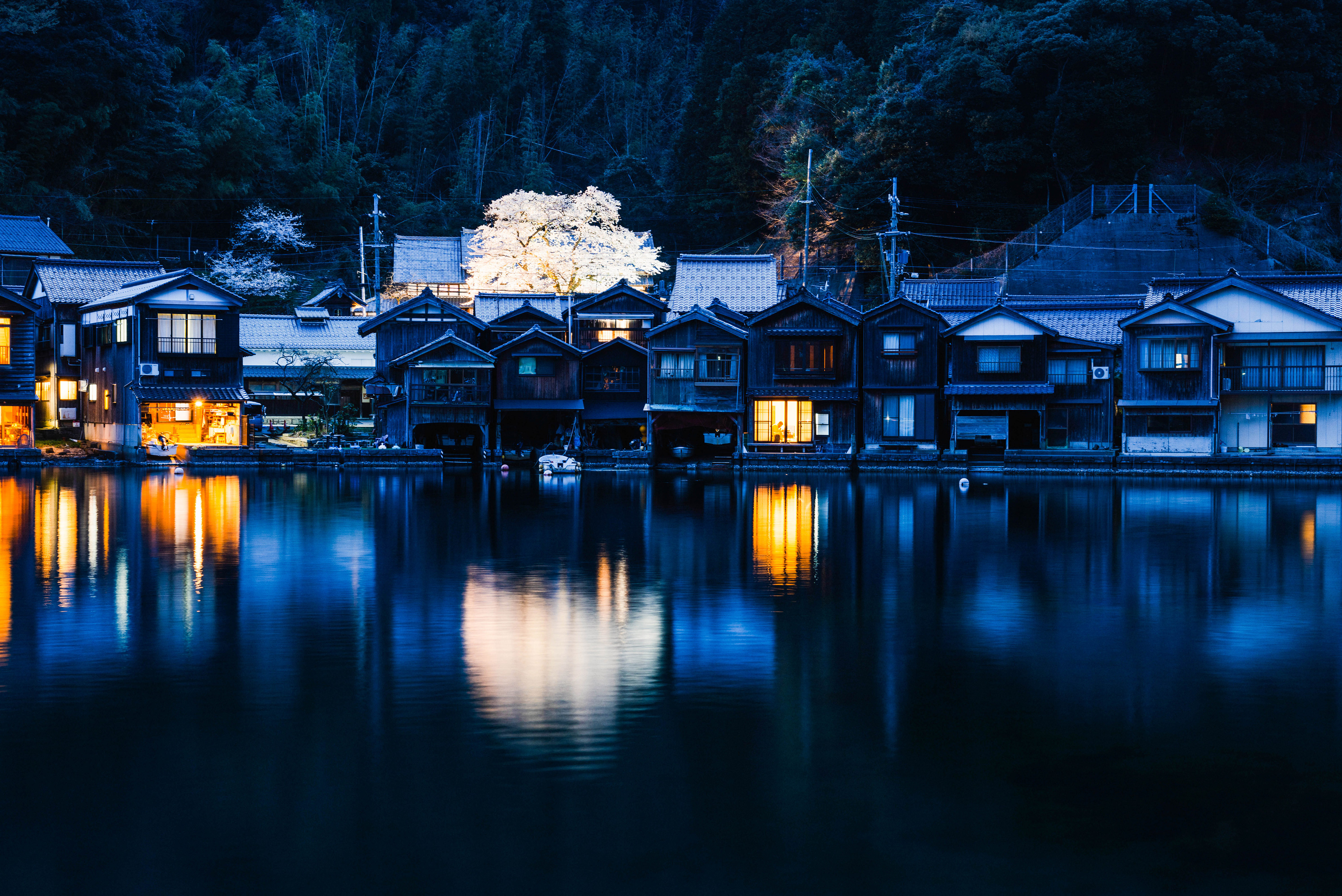 inverted water reflection night building lights trees computer wallpaper 4K wallpaper