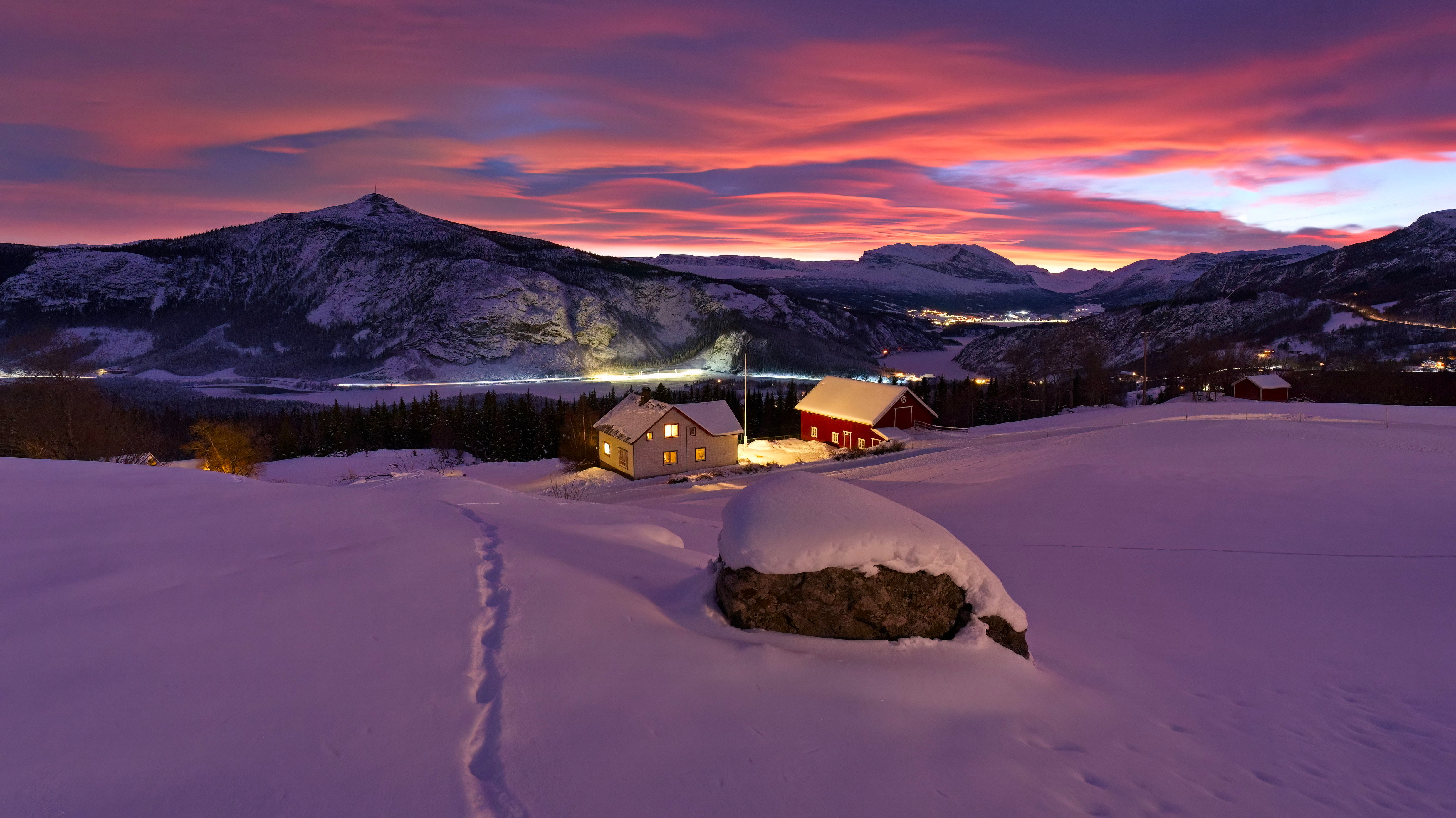 nature landscape lights mountains trees clouds sky winter house sunset road snow orange clouds 4K wallpaper