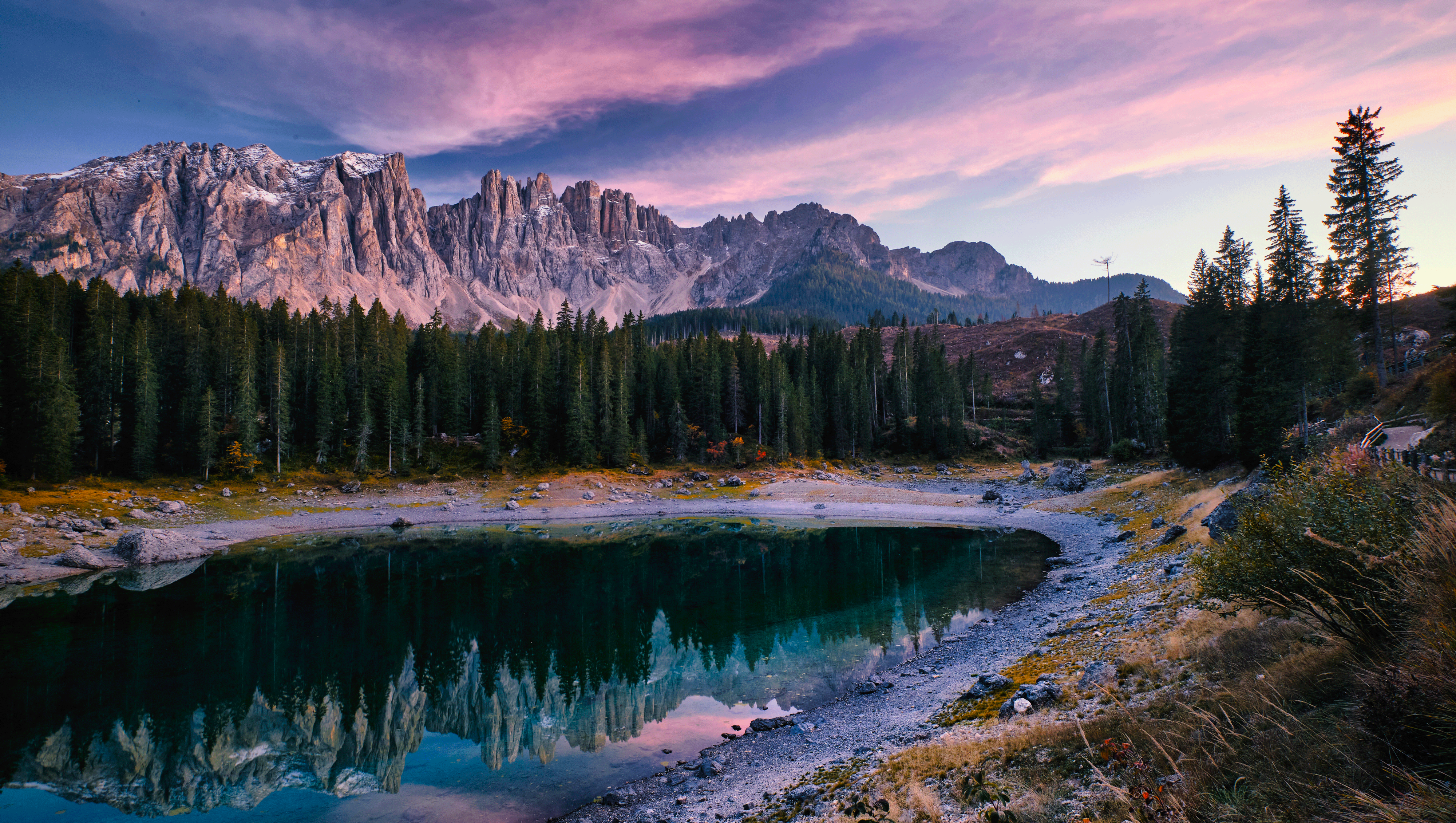nature landscape sky cloud mountain range rock snow trees forest pine trees water lake grass plant reflection 4K wallpaper