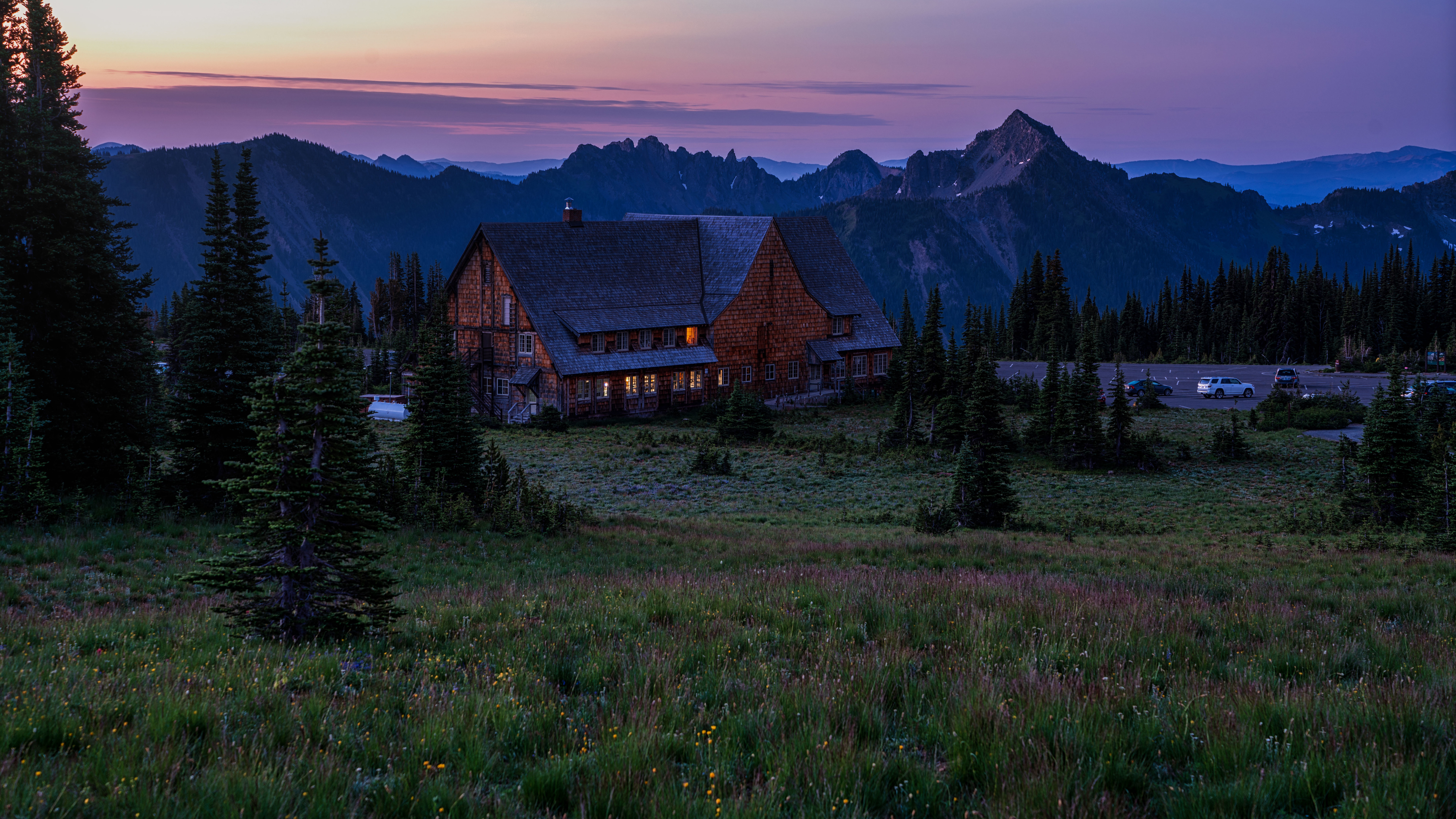 nature landscape trees grass car houses mountains clouds sky lights national park 4K wallpaper