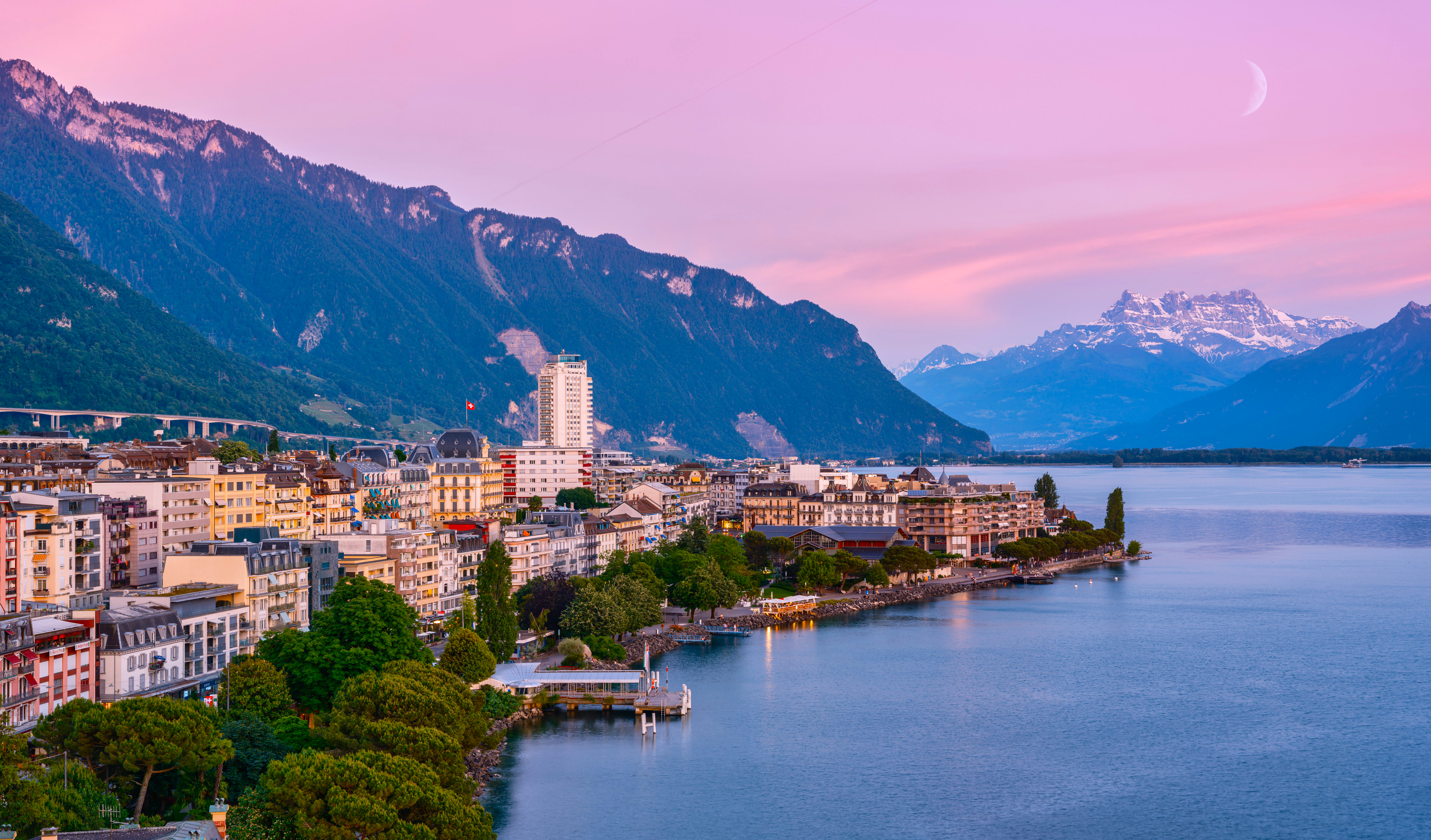 nature landscape trees mountains sky moon architecture pier town crescent river lake city landscape 4K wallpaper