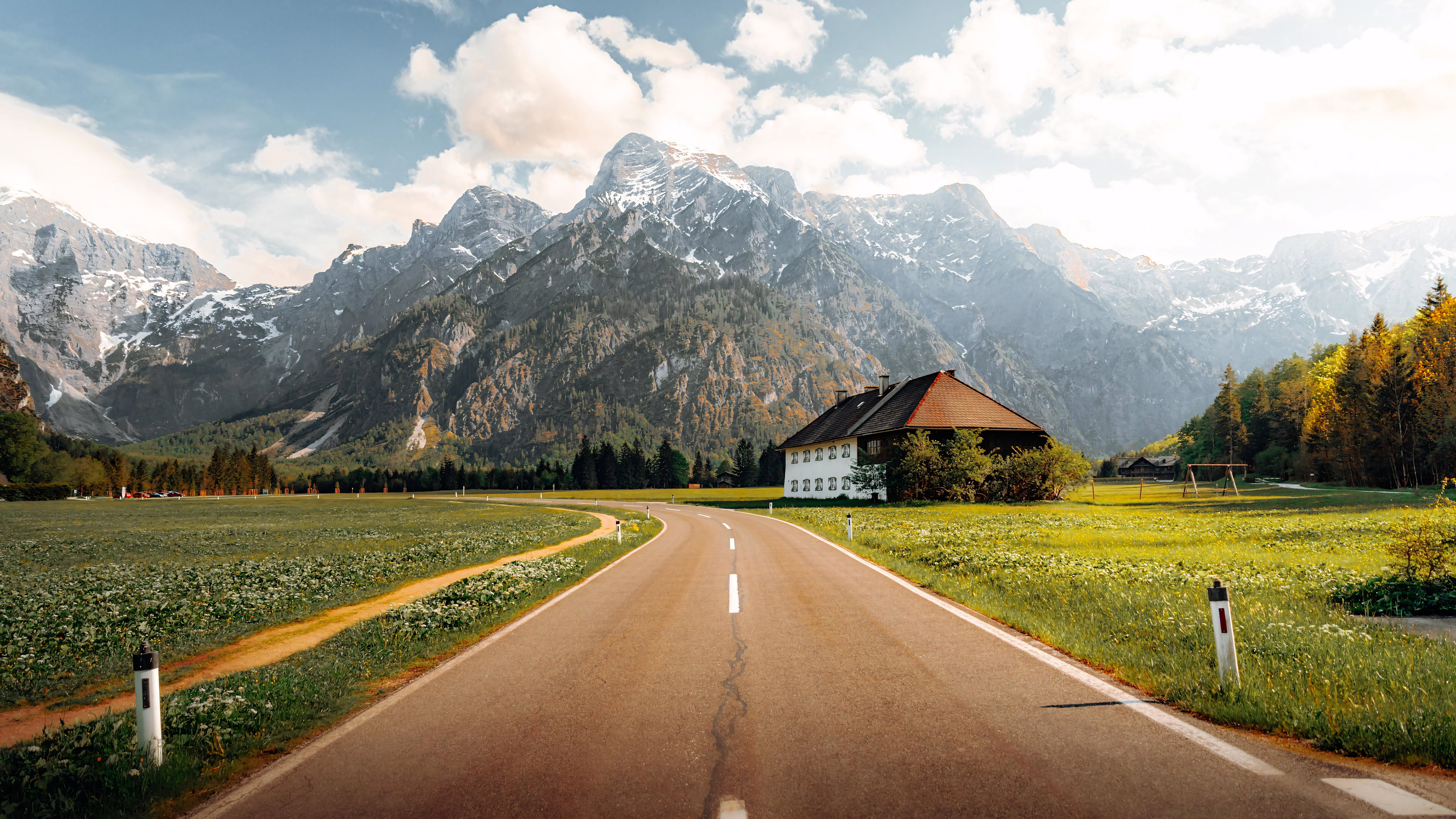 nature road house trees grass field mountains sky cloud path 4K wallpaper