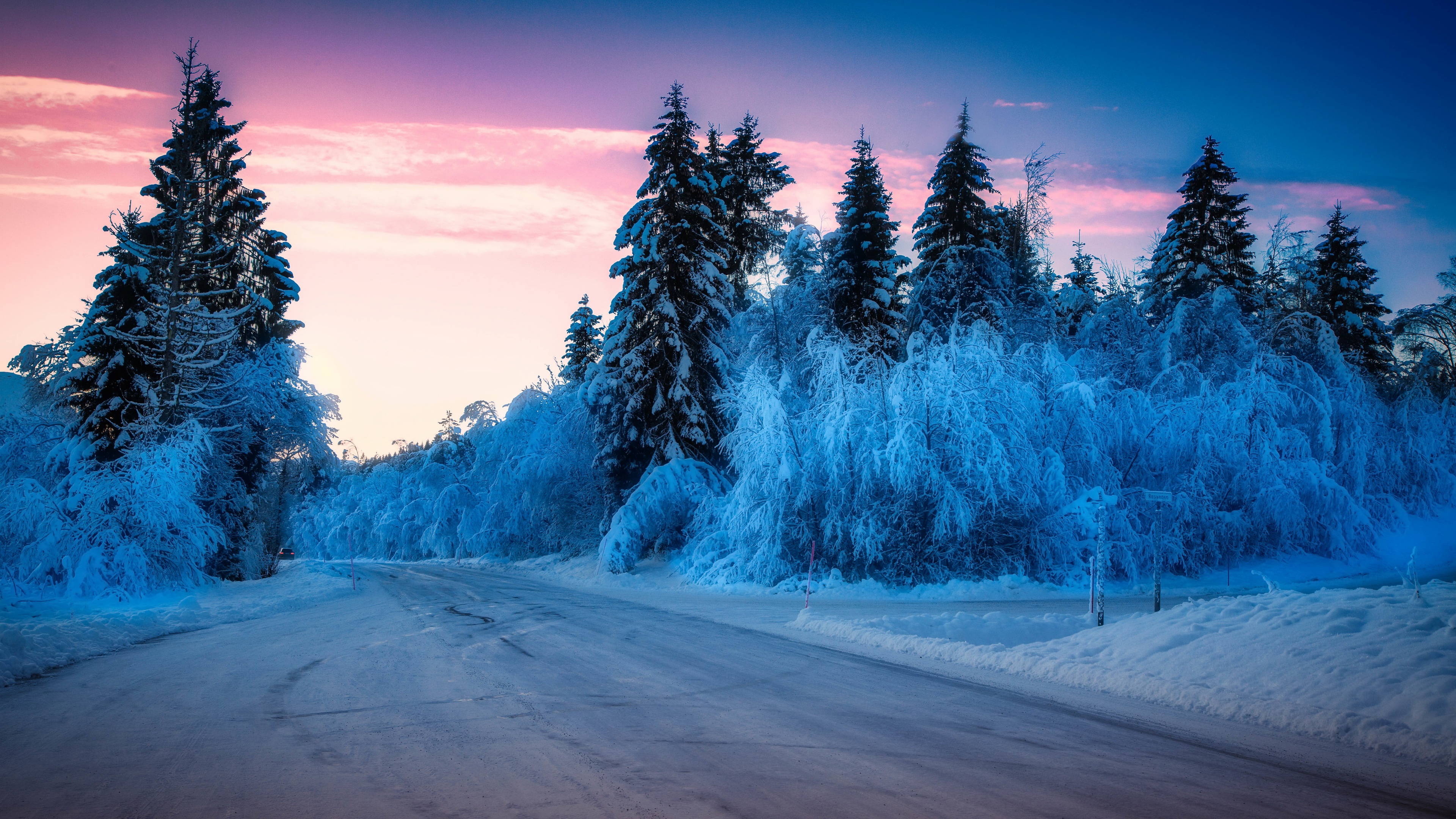 winter outdoor ice cold snow road purple sky sunshine 4K wallpaper