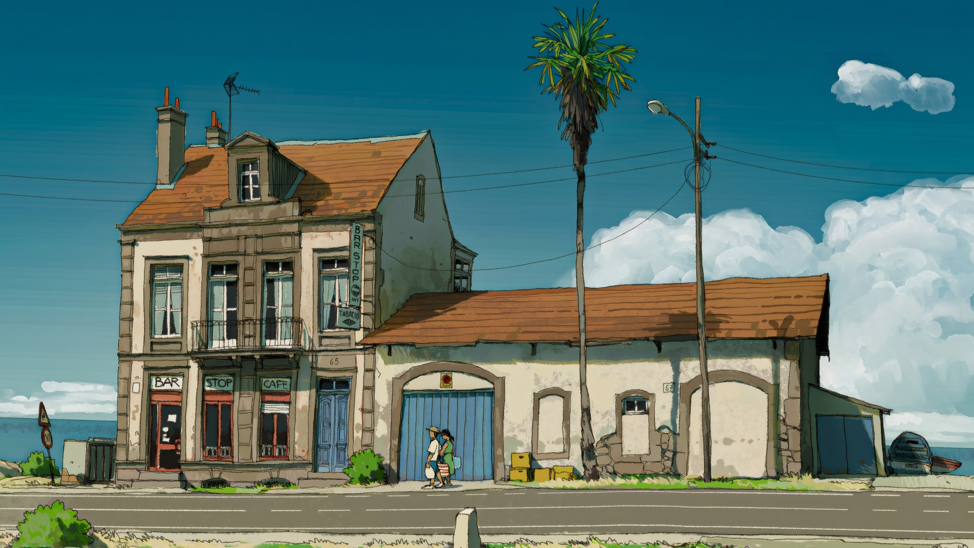 - Home > Vision Wallpaper >Free download Palm trees cloud road coast bar telephone pole boat road sign 4K wallpaper